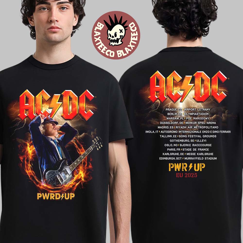 Acdc Pwr Up Europe 2025 Tour Merch Angus Electric Photo With Tour Dates Two Sided T-shirt