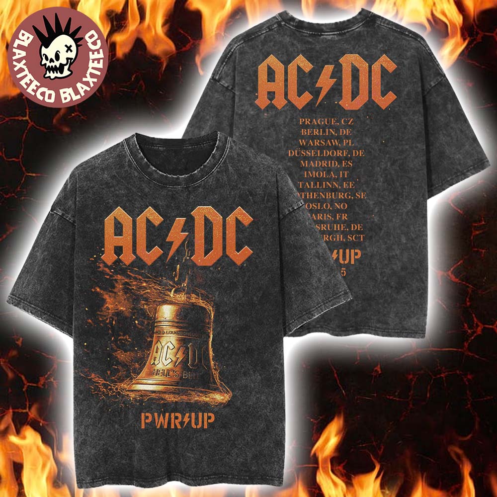 Acdc Pwr Up Europe 2025 Tour Merch Hells Bells Lightning With Tour Dates Two Sided Washed T-shirt