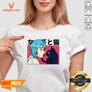 Japanese Anime Blue Haired Neko Girl Cute Black Cat V-neck